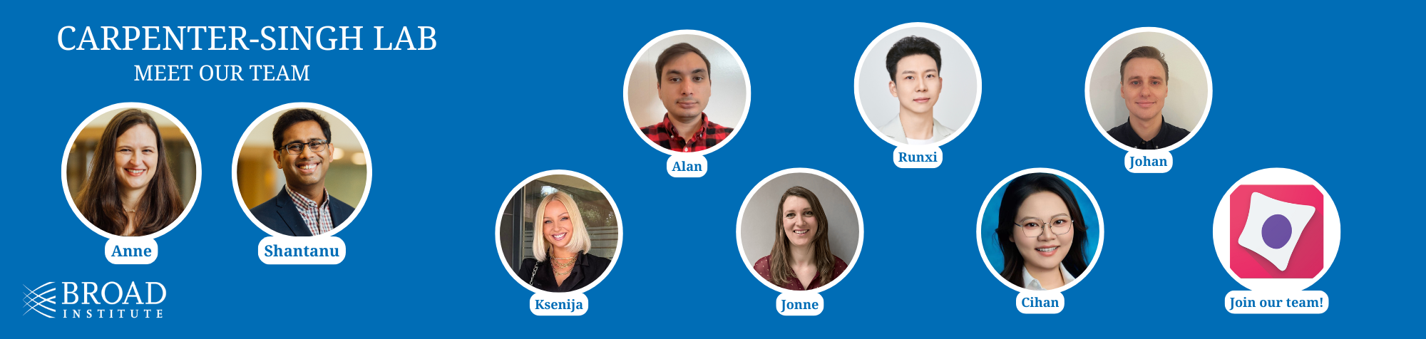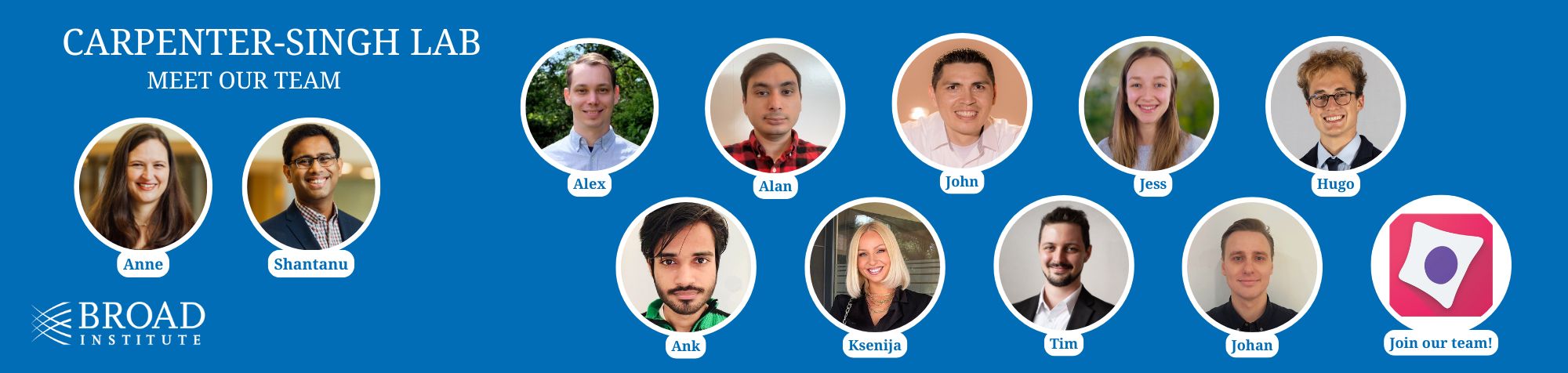 The Carpenter–Singh Lab is part of the Imaging Platform based at the Broad Institute of MIT and Harvard in Cambridge, Massachusetts, USA. It is led by Anne Carpenter and Shantanu Singh. Our research group develops advanced methods and software tools to quantify and mine the rich information present in cellular images to yield biological discoveries.