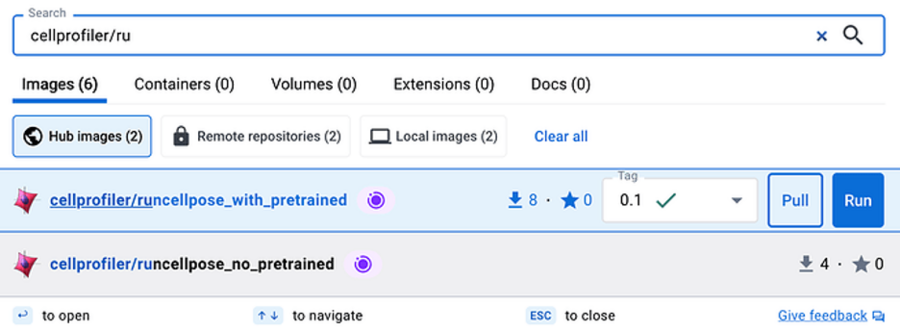 - The Dockerfile itself is pretty good sized - ~12GB. We will be looking to slim that down if possible, but no matter the eventual size, the first time you try to use it, it will need to download to your system - you can do this within CellProfiler, if you want, or you can do it in Docker Desktop (see screenshot below). Just be prepared to wait a bit, based on your download speeds! This step only needs to be done once per Docker container you want to use, so it should only need to be done very infrequently.