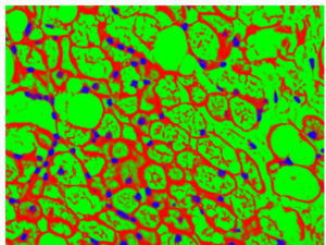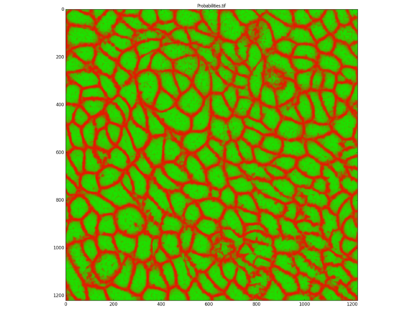 In this case, we can use ilastik as Kyle has demonstrated to generate a probability map of cell components, i.e. nuclei in blue, cell boundaries in dark red, and lipid droplets/ empty space in green: