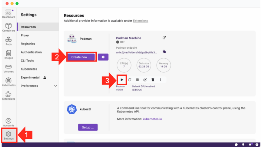 Alternatively, you can also perform these steps in the GUI using Podman Desktop by going to Settings and, under Podman, selecting Create New...