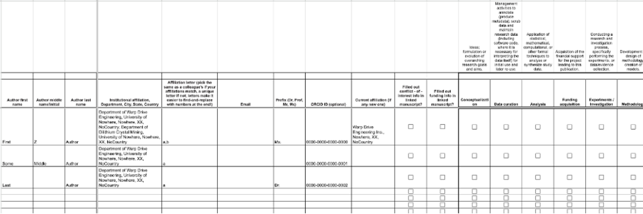 We've now organized a couple different large projects using the CRediT contribution system for tracking author contributions towards various papers, and in general it has worked really nicely (H/T to QUAREP WG 12 for introducing me to this system, as part of this awesome project)! CRediT makes it easy to figure out who did what in a structured way, which helps with defining the many kinds of contributions folks have made (even some you may have forgotten you made or not realized it was a contribution!). To help it scale, we prefer to have each author fill out their own row, which we realized was massively facilitated by having it as a Google Sheet (or any other editable cloud shared file, as you prefer). We initially built this for ourselves, but we hope it helps the community, so we've made a blank template copy anyone can copy and use! Go to the File menu and then either make a copy, or download to use in Excel* or move to your favorite online fileshare.