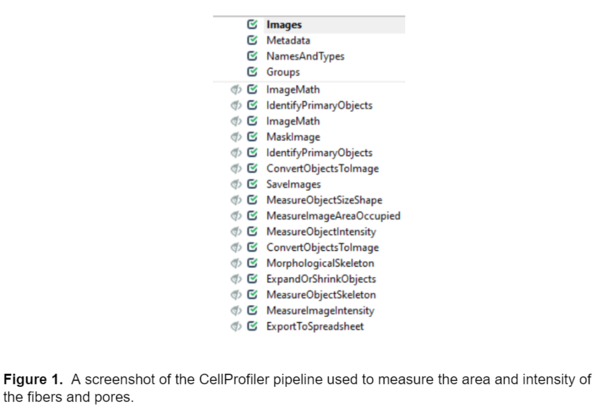 Finally, ExportToSpreadsheet exports these measurements to a .csv file. When run to completion the pipeline will produce four separate excel sheets titled MyExpt_Fibers, MyExpt_Image, MyExpt_Pores, MyExpt_small_fiber, and a folder titled Labels. The “Labels” folder contains the label matrices for each image processed in the pipeline. The excel files contain all the data measured including area and intensity for fibers and pores within the image. MyExpt_Image contains information on the image as a whole, such as the percentage of the total area of the image occupied by fibers. MyExpt_Fibers and MyExpt_Pores contain area and intensity data about each fiber and pore in the image respectively. These files also have the mean intensity and area for each fiber/pore in an image. The MyExpt_small_fiber file contains data about the branching and general structure of the fibers including the number of branch ends, non-trunk branches and number of trunks on each fiber.
