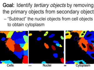 Tertiary objects are created by looking at the difference between two other objects (such as saying the cytoplasm is the difference between the whole cell and the nucleus) – hence they’re the “third”.