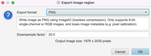 /** * Script to export image tiles (can be customized in various ways). */ extension = '.tif' // Get the current image (supports 'Run for project') def imageData = getCurrentImageData() // Define output path (here, relative to project) def name = GeneralTools.getNameWithoutExtension(imageData.getServer().getMetadata().getName()) def pathOutput = buildFilePath(PROJECT_BASE_DIR, 'tiles', name) mkdirs(pathOutput) // To export at full resolution double downsample = 1 // Create an exporter that requests corresponding tiles from the original & labeled image servers new TileExporter(imageData) .downsample(downsample) // Define export resolution .imageExtension(extension) // Define file extension for original pixels (often .tif, .jpg, '.png' or '.ome.tif') .tileSize(2048) // Define size of each tile, in pixels .annotatedTilesOnly(true) // If true, only export tiles if there is a (classified or unclassified) annotation present .overlap(0) // Define overlap, in pixel units at the export resolution .writeTiles(pathOutput) // Write tiles to the specified directory def dirOutput = new File(pathOutput) for (def file in dirOutput.listFiles()) { if (!file.isFile() || file.isHidden() || !file.getName().endsWith(extension)) continue def newName = file.getName().replaceAll("=","-").replaceAll("\\[","").replaceAll("\\]","").replaceAll(",","_") if (file.getName() == newName) continue def fileUpdated = new File(file.getParent(), newName) println("Renaming ${file.getName()} ---> ${fileUpdated.getName()}") file.renameTo(fileUpdated) } println('Done!')