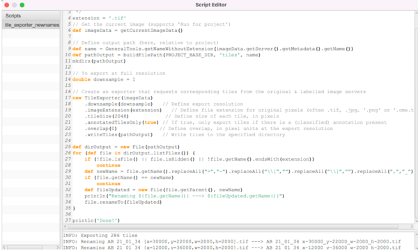 Drag and drop the file ‘tile_exporter_newnames.groovy’ from the scripts folder into QuPath. This will open the ‘Script editor’ window. This script was adapted from a image.sc forum thread by Pete Bankhead and Mike Nelson and was tweaked for this experiment.