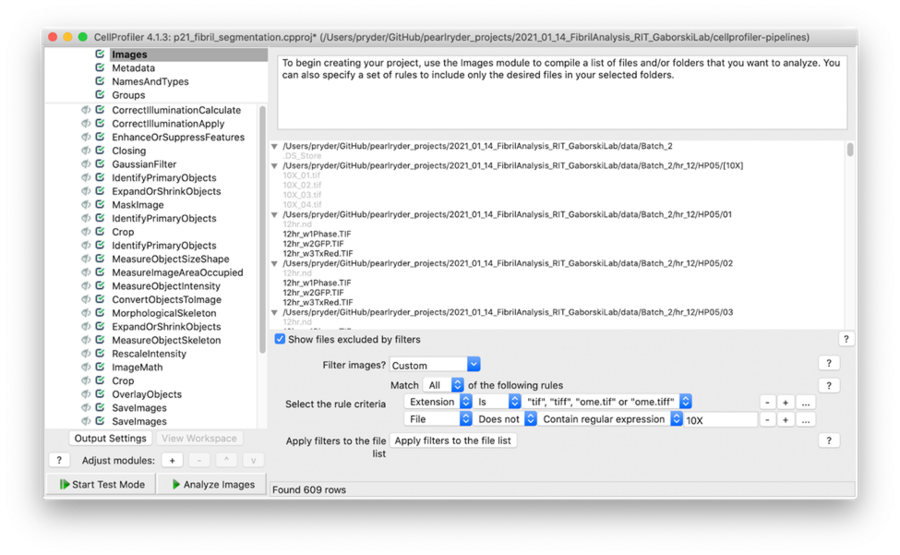 A simple way to exclude images from the analysis is to add a filter within the input module. In this pipeline, I applied filters to include only tiff files that do not contain the expression 10X.